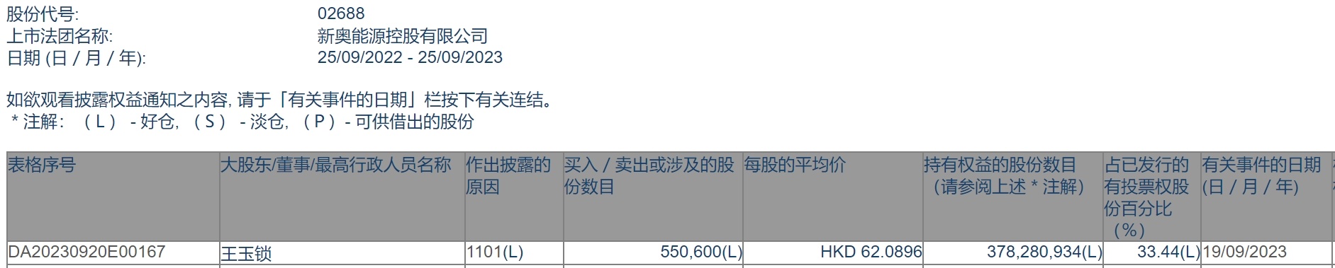 智通财经APP获悉,香港联交所最新资料显示,9月19日,董事局主席王玉锁增持新奥能源(02688)55.06万股,每股作价为62.0896港元;总金额约为3418.65万港元。增持后最新持股数目约为3.78亿股,最新持股比例为33.44%。