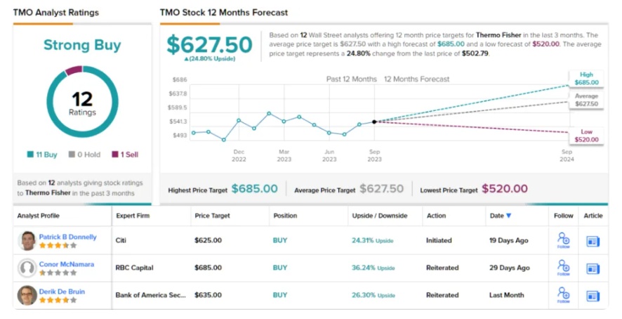 总体而言,华尔街对赛默飞世尔持乐观态度。在过去三个月内,有11位分析师予以“买入”评级,1位予以“卖出”评级,一致评级位“强烈买入”。627.50美元的平均目标价意味着,该股有约25%的上行空间。