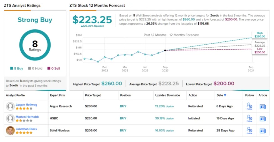 总的来说,华尔街其他分析师都支持这一观点。所有8位分析师予以Zoetis“买入”评级,平均目标价为223.25美元,意味着该股将有26%的上行空间。