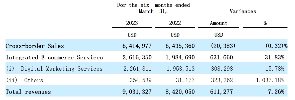 但进入2023财年上半年,传丞数字的总收入增速已下滑至7.26%,这主要是因为公司核心业务跨境销售的收入下滑0.32%所拖累,而综合电子商务服务则保持快速成长,期内收入增长31.83%。