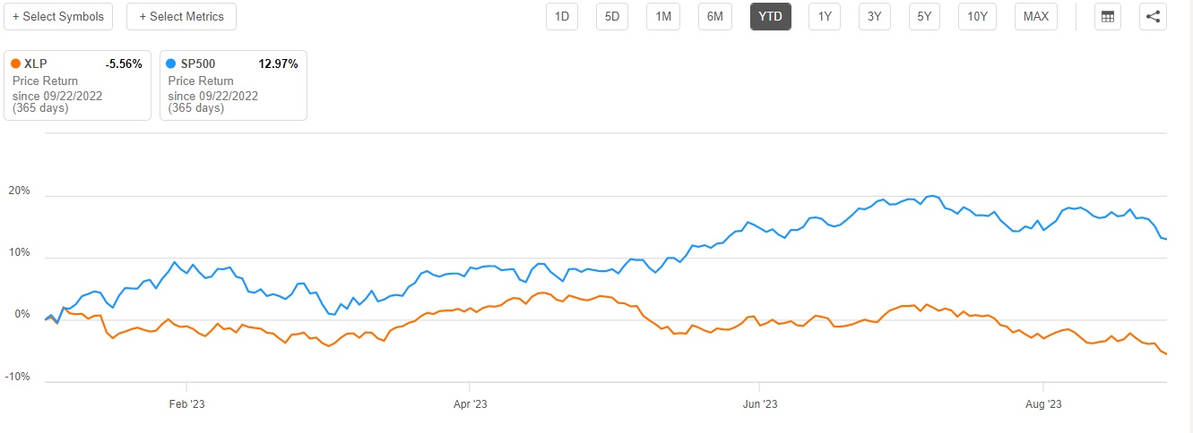 涵盖沃尔玛(WMT.US)、好市多(COST.US)、可口可乐(KO.US)、奥驰亚(MO.US)等众多明星消费股的日常消费行业指数ETF(XLP.US)今年以来跌幅超5%,表现远远不及标普500指数。