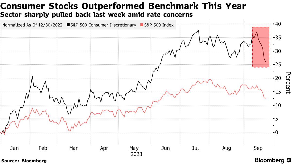 数据显示,从消费定义分类来看,包括亚马逊(AZMN.US)和特斯拉(TSLA.US)在内的美国非必需消费类股票今年迄今累计上涨26%,是标普500指数13%涨幅的两倍。上周,由于美联储暗示将在更长时间内维持高利率以对抗通胀,标普500指数的消费成分板块在这股风险资产抛售浪潮中暴跌6%以上。