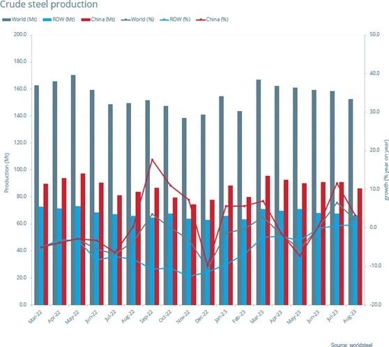 智通财经APP获悉,9月26日,世界钢铁协会披露,2023年8月全球63个纳入世界钢铁协会统计国家的粗钢产量为1.526亿吨,同比提高2.2%。