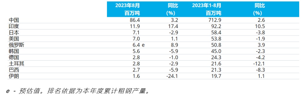 2023年8月,中国粗钢产量为8641万吨,同比提高3.2%;印度粗钢产量为1190万吨,同比提高17.4%;日本粗钢产量为710万吨,同比下降2.9%;美国粗钢产量为700万吨,同比提高1.1%;俄罗斯粗钢预估产量为640万吨,同比提高8.9%;韩国粗钢产量为560万吨,同比下降5.9%;德国粗钢产量为280万吨,同比下降1.0%;土耳其粗钢产量为280万吨,同比下降2.9%;巴西粗钢产量为270万吨,同比下降5.9%;伊朗粗钢产量为160万吨,同比下降24.1%。