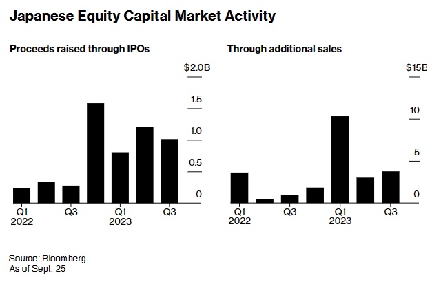 智通财经APP获悉,美国银行日本证券有限公司表示,日本领先全球的股市涨势将在明年继续推动其一级和二级股票市场的销售。数据显示,截至目前,2023年日本首次公开募股(IPO)和增发股票的收益已超过200亿美元,较去年同比增长了3.5倍。与此同时,以美元计算的基准股指东证指数飙升了约11%,超过了全球同类指数的涨幅。