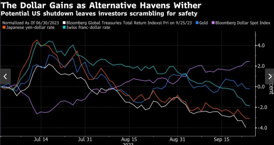 智通财经获悉,美元再次证明,它是唯一重要的避险货币。随着即将到来的美国政府停摆突显出美国财政挥霍将刺激债券发行的可能性,美国国债正在暴跌,即美债利率飙升,并拖累其它债券市场下跌。由于美联储决心在更长时间内维持较高利率,投资者除了美元之外,几乎找不到其他投资选择。