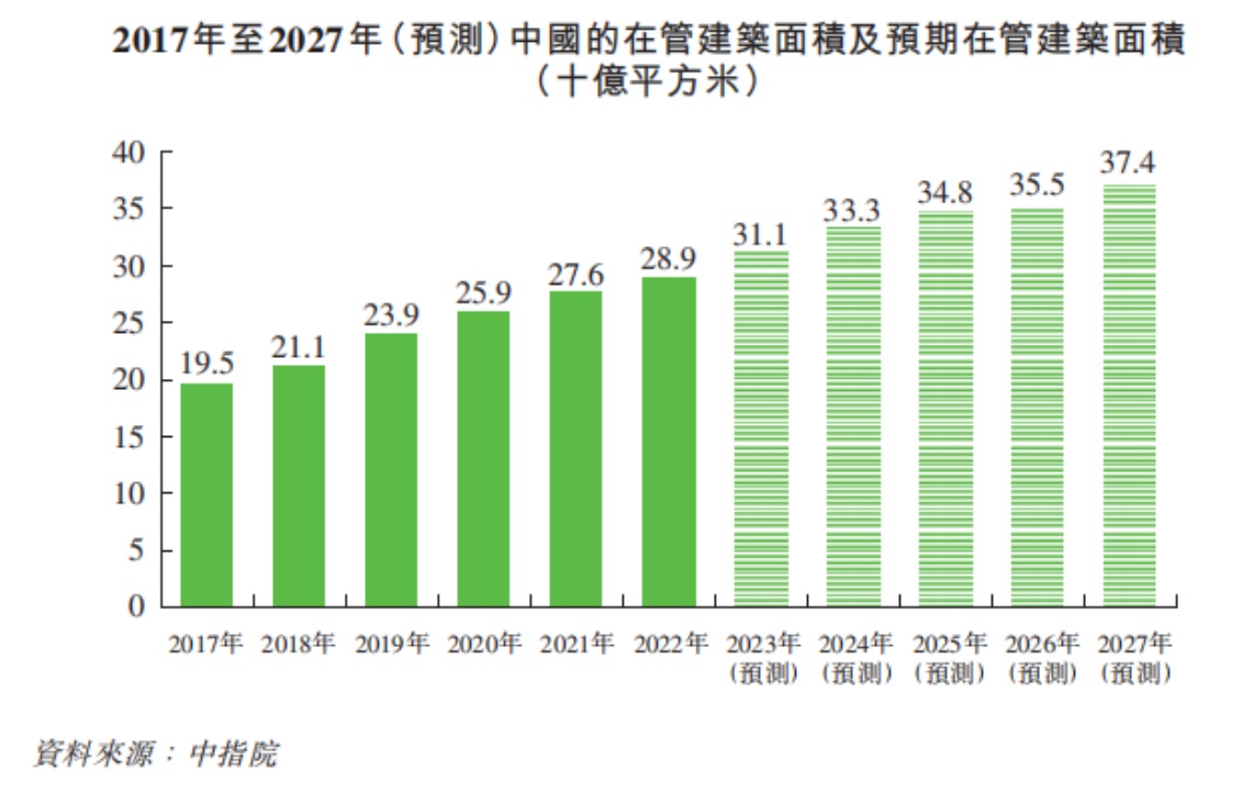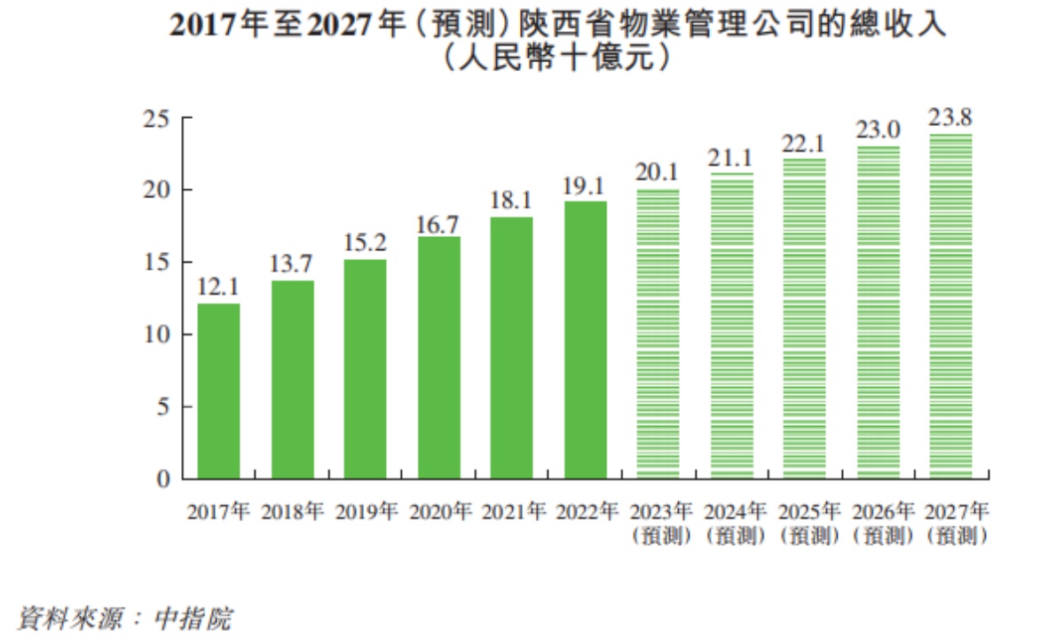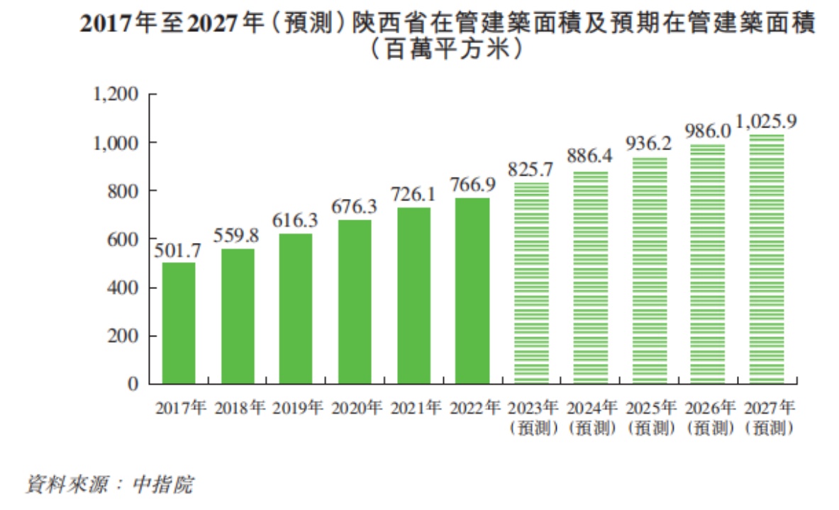 就陕西省而言,截至2022年,陕西省物业管理公司的在管总建筑面积由2017年的约5.02亿平方米增加至2022年的约7.67亿平方米,复合年增长率为8.9%。根据中指院的预测,陕西省物业管理公司的预期在管总建筑面积将由2023年的约8.26亿平方米增加至2027年的10.26亿平方米,复合年增长率为5.6%。