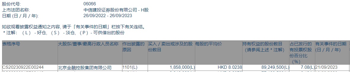 智通财经APP获悉,香港联交所最新资料显示,9月21日,北京金融控股集团有限公司增持中信建投证券(06066)185.8万股,每股作价8.0238港元,总金额约为1490.82万港元。增持后最新持股数目为8924.95万股,最新持股比例为7.08%。